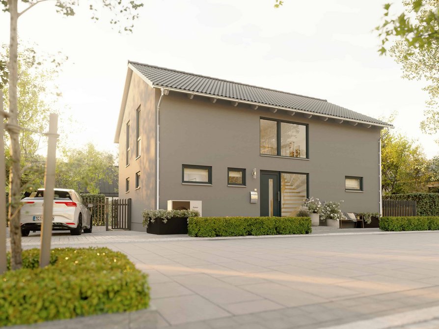 Im Erdgeschoss entsteht durch den großzügigen Wohn und Essbereich viel Platz für das Familienleben. Große Fenster sorgen für helle Räume und eine angenehme Wohnatmosphäre. Die Küche bietet Raum für eine gemütliche Essecke und kurze Wege im Alltag. Ein weiteres Zimmer im Erdgeschoss eignet sich ideal als Arbeits oder Gästezimmer.