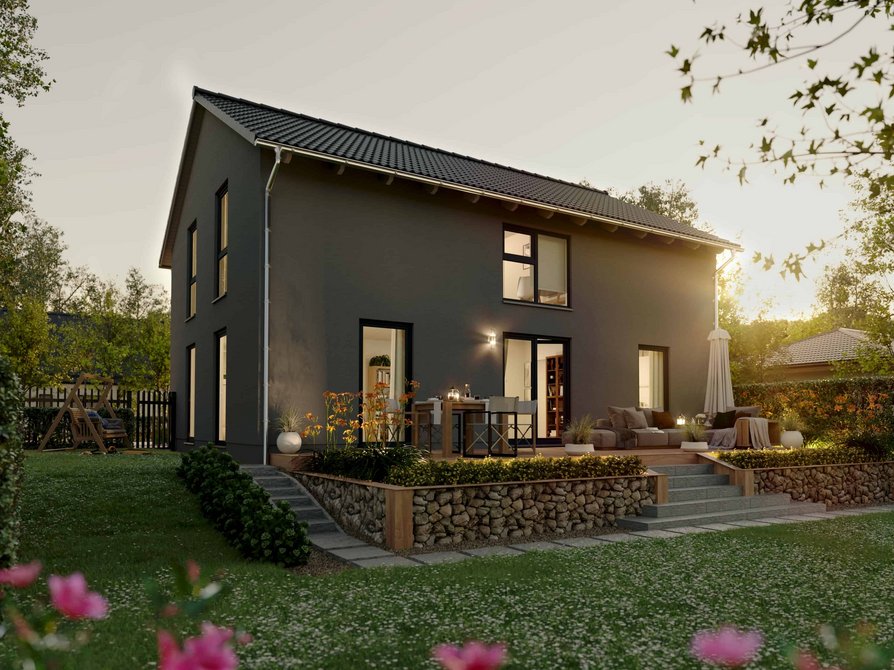 Das Landhaus 142 Modern in der Variante Elegance verbindet klassische Landhausarchitektur mit moderner Großzügigkeit. Große Fensterflächen lassen viel Tageslicht ins Haus und schaffen eine helle Wohnatmosphäre. Der weitläufige Wohn und Essbereich bildet das Herz des Hauses und bietet viel Platz für gemeinsame Zeit mit Familie und Gästen.