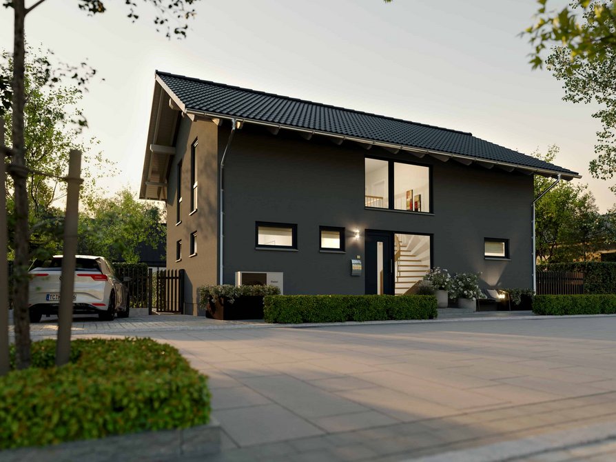 Das Landhaus 142 Modern in der Variante Süd setzt einen besonderen Akzent mit seinem markanten Dach und dem großzügigen Dachüberstand. Der weit auskragende Dachüberstand schützt Fassade und Eingangsbereich und verleiht dem Haus eine klassische und zugleich sehr prägnante Landhausoptik.